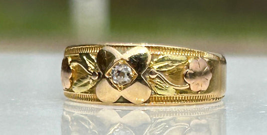 18k Yellow, Green and Rose Gold Floral and Rose Cut Diamond Band