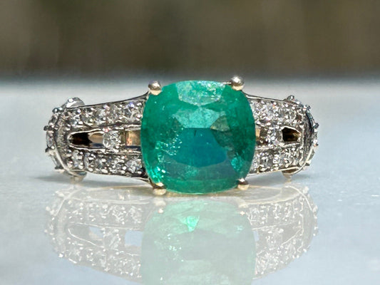 2.5 Ct Cushion Cut Natural Emerald and .50 ctw Diamond Ring