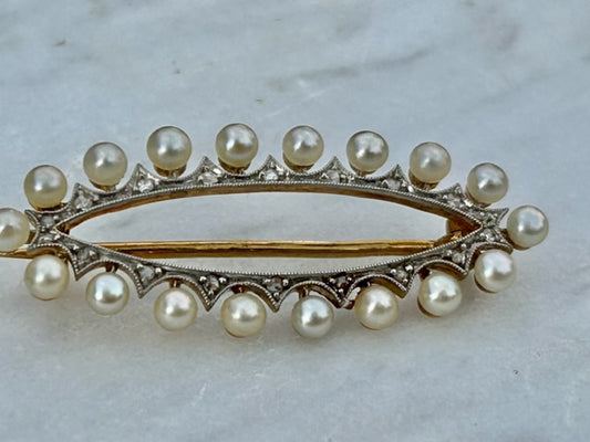 Antique Art Deco Pearl and Diamond 18ct Brooch with Enclosed Gold Back.
