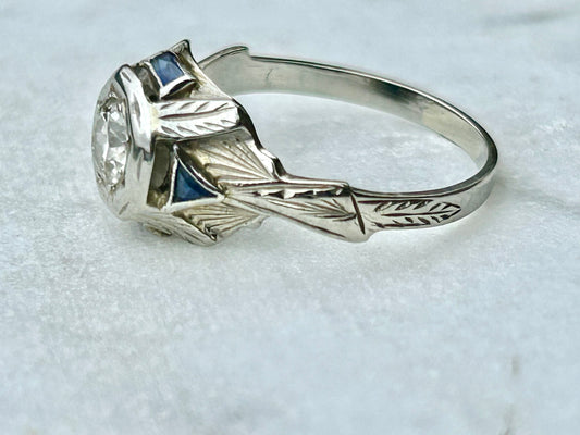 Art Deco .45 Diamond and Sapphire 18k White Gold Engagement Ring