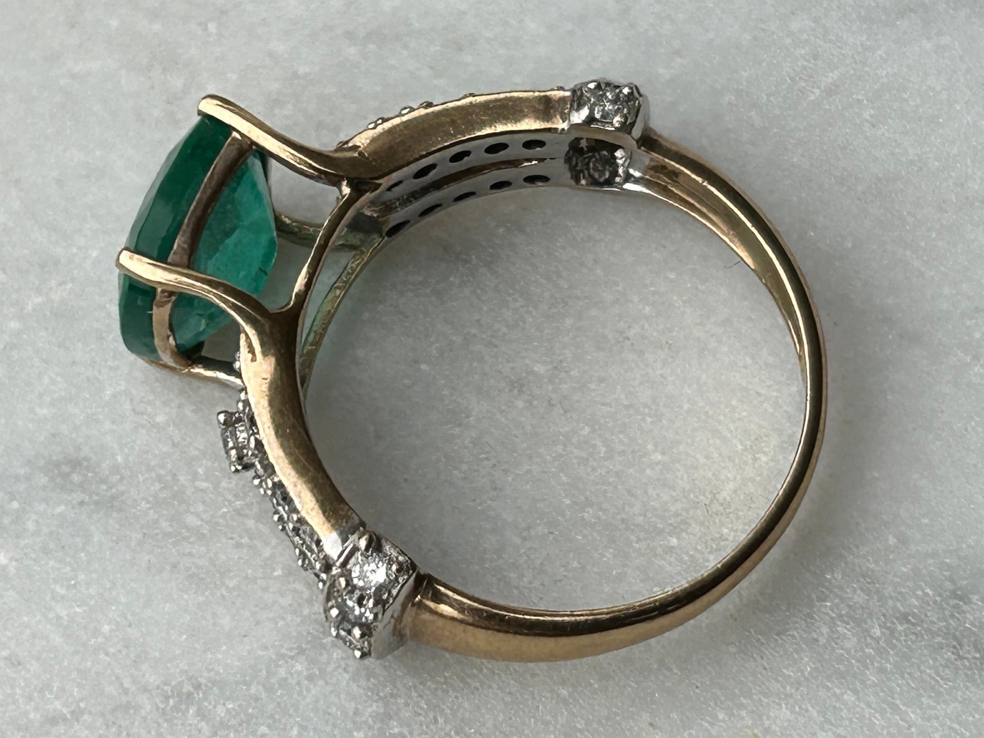 9.2 mm x 9 .2mm x 4.75 depth Cushion Cut Emerald and 32 diamonds weighing .50ctw with diamond setting in Rhodium Shank is marked 9k but test as 10k.
