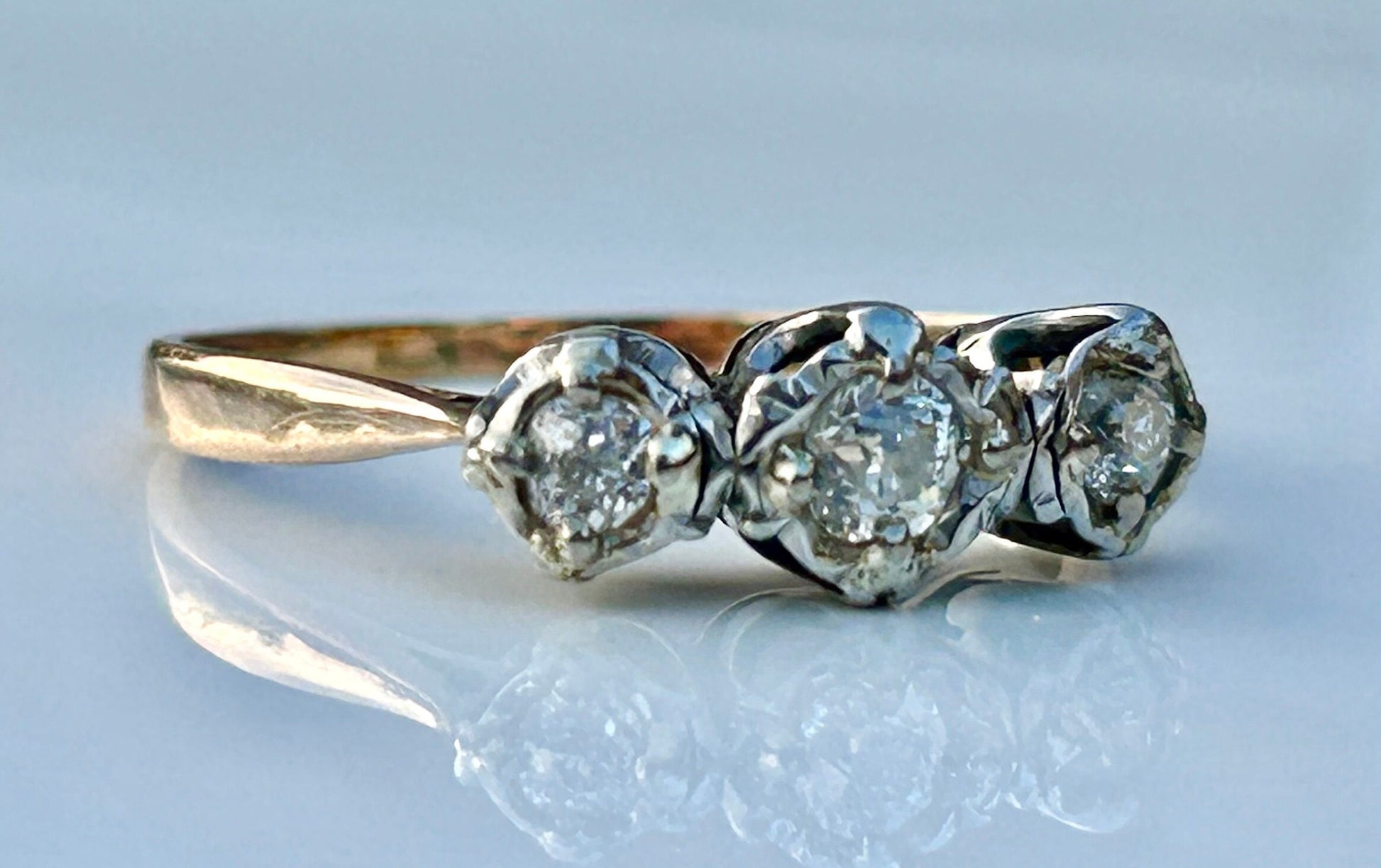 Antique Old European Cut Diamond Trilogy 18k Yellow Gold and Platinum Engagement Ring