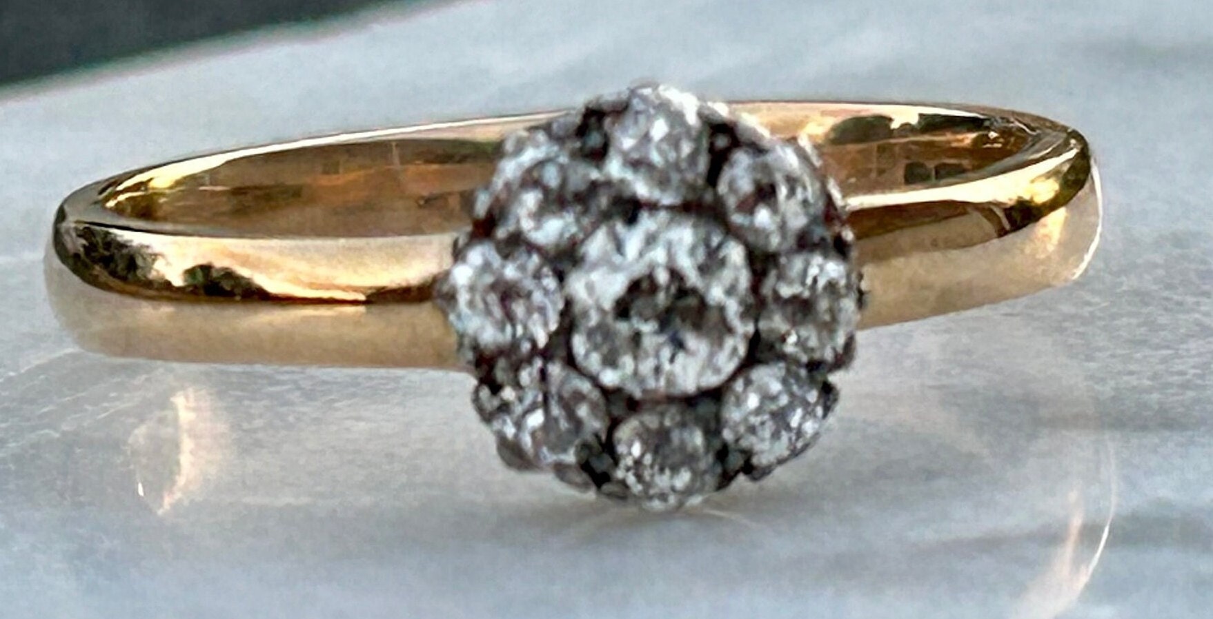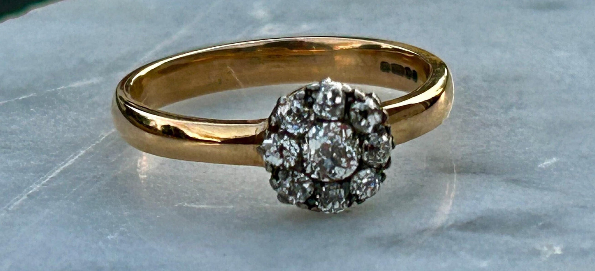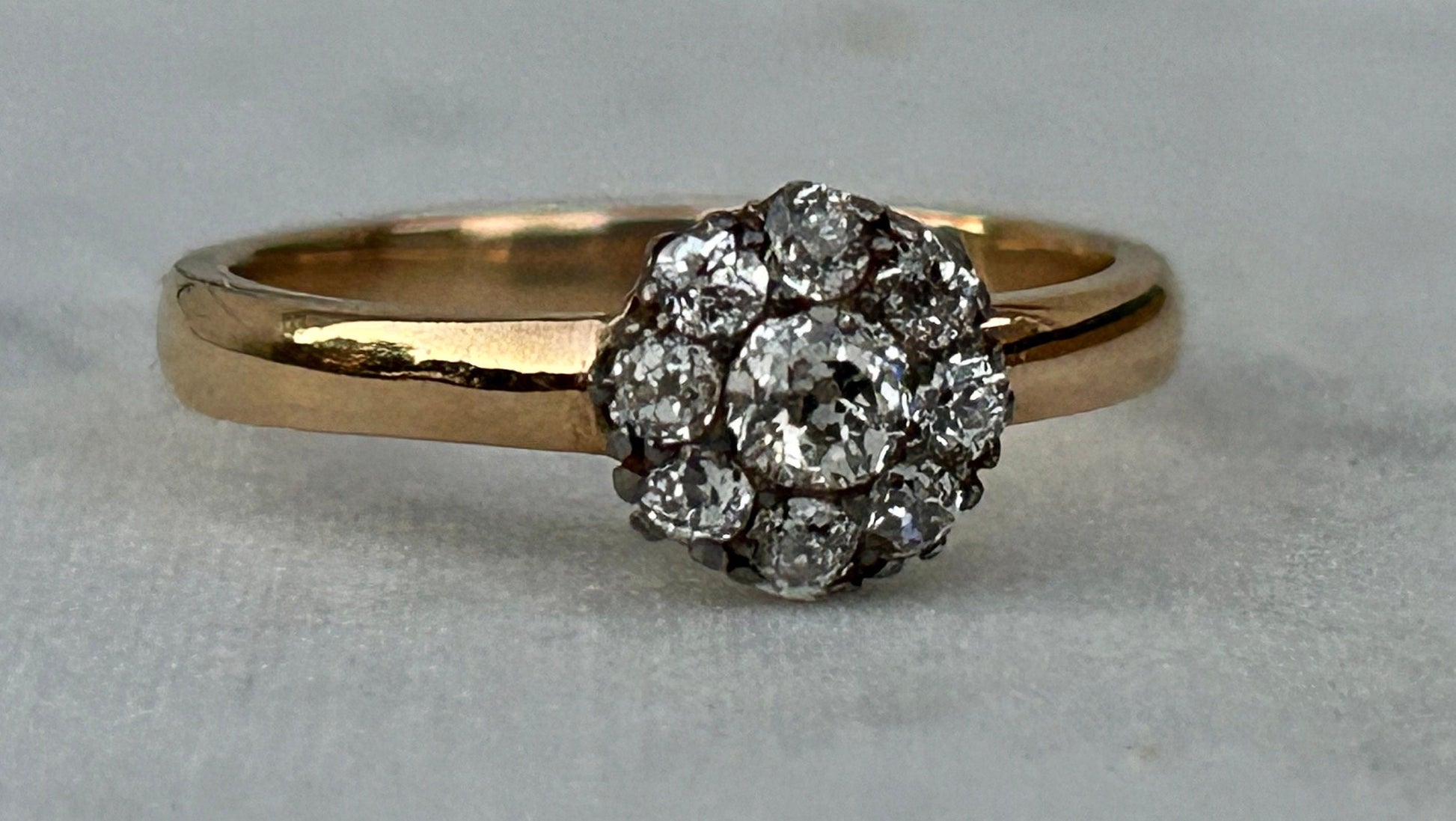 A beautiful Antique Old Mine Cut Diamond Flower cluster ring. This would make the sweetest engagement ring or right hand ring. The diamonds are vibrant and extremely clear. They are a striking bright white color and perfectly matched. The diamond cluster is dainty while the gold band is weighty and bold. This juxtaposition is unique and works wonderfully together. The 9 carat gold is glowing. Fully Hallmarked.