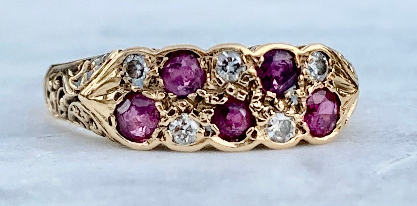Antique Victorian Ruby and Diamond Ring. The detailing on this is incredible! I love them engraving and the fun checkerboard pattern of the rubies and diamonds. 9ct Gold. Size 7.25. Weight 3 grams.