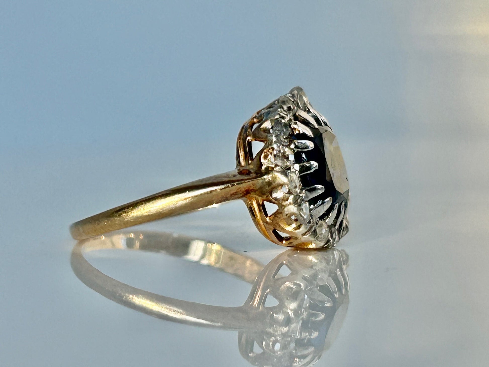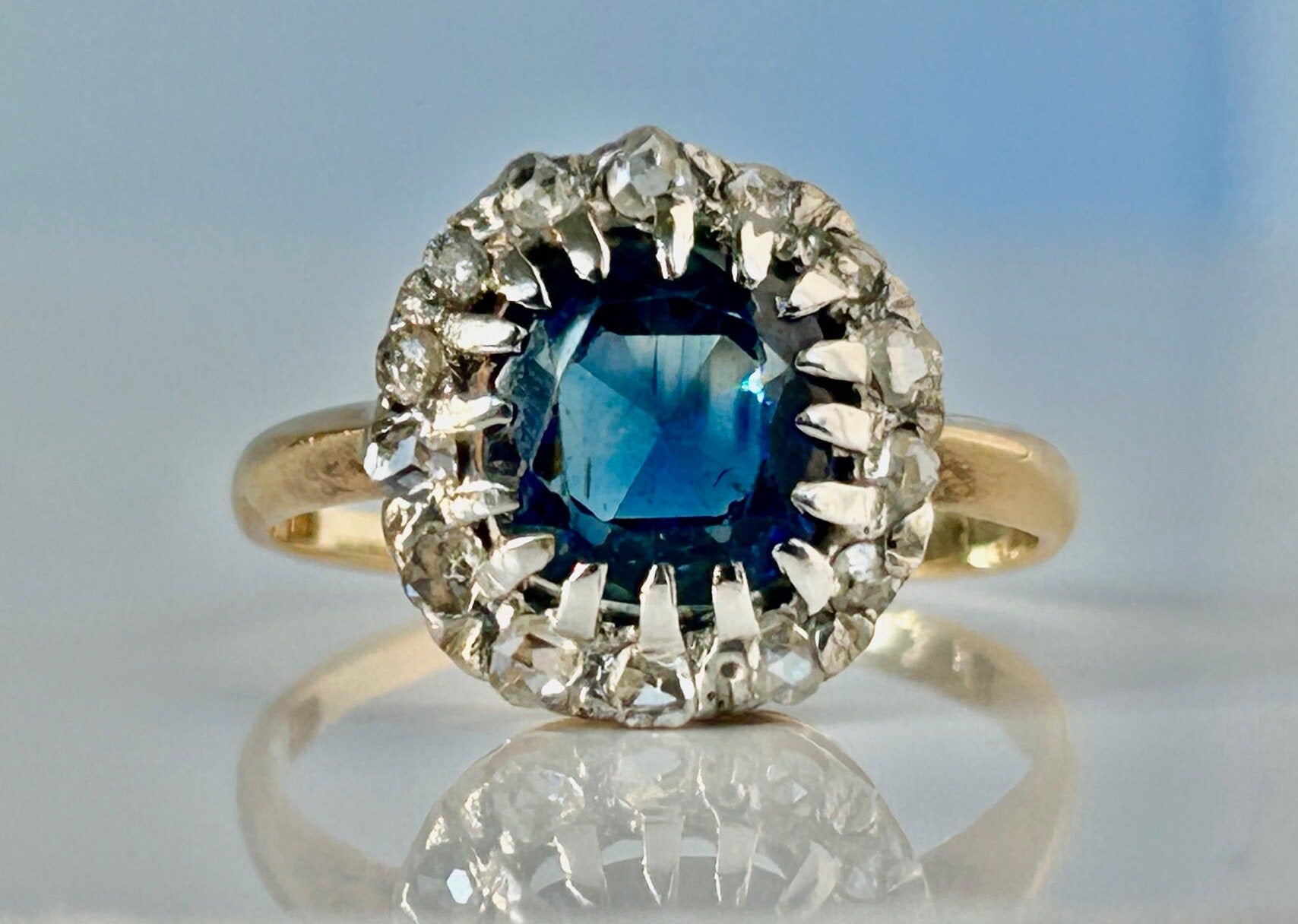 Victorian handmade 2.29 carat Cushion Cut Ceylon Sapphire and Rose Cut Diamond 18k gold and Platinum set Ring.