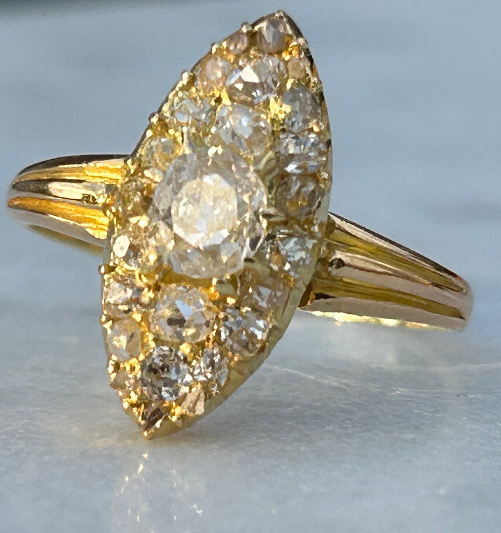 Antique Victorian Old Mine Cut Diamond Navette Cluster Ring