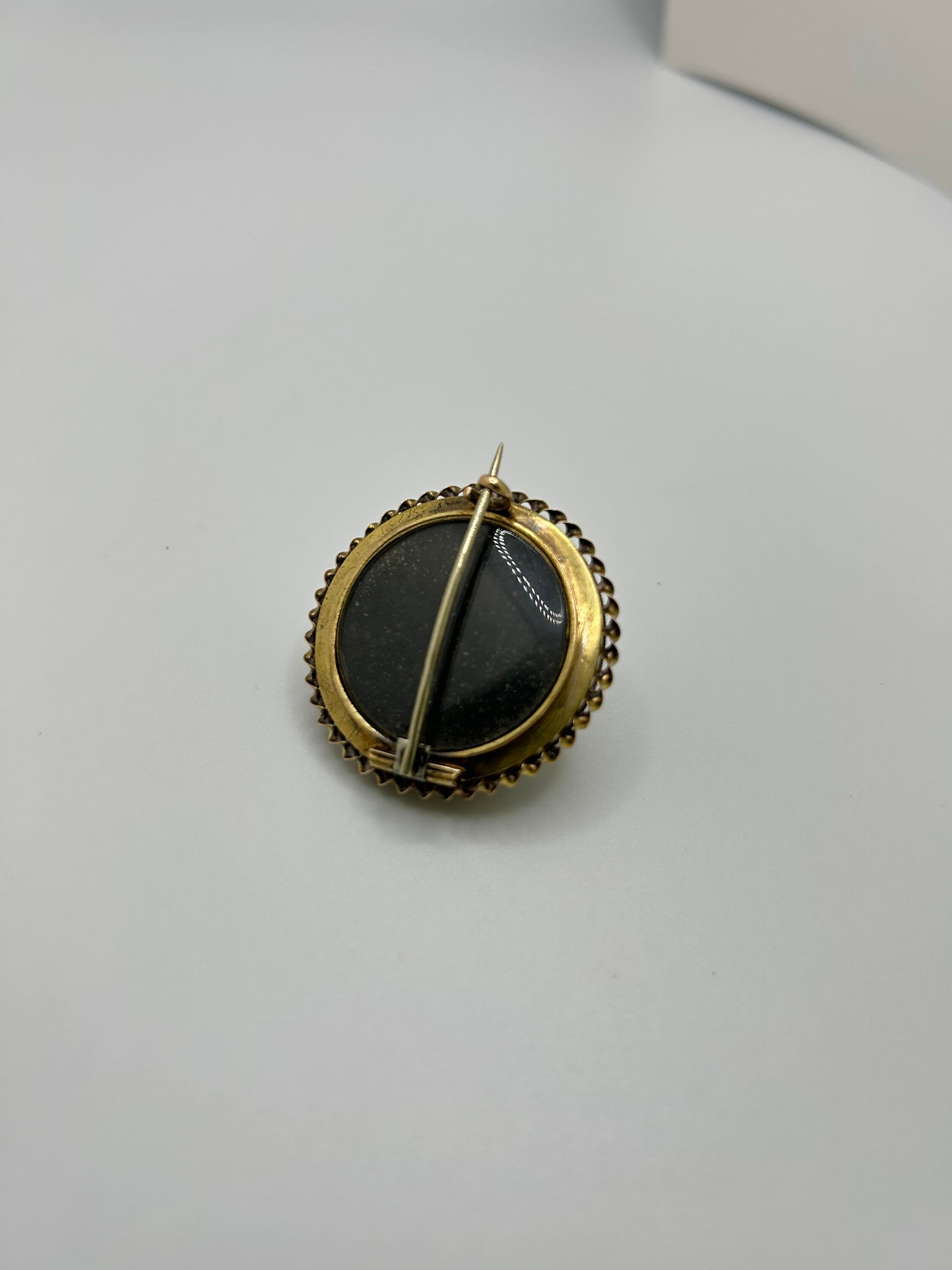 AN ANTIQUE TURQUOISE AND DIAMOND 18k BROOCH brooch. The domed body is set to the centre with a rose cut diamond on a ground of pave set cabochon turquoise, accented by further cabochon turquoise and intricately beaded and twisted gold, with a glass covered locket to the reverse, no assay marks, 3.5cm, 12.4g.