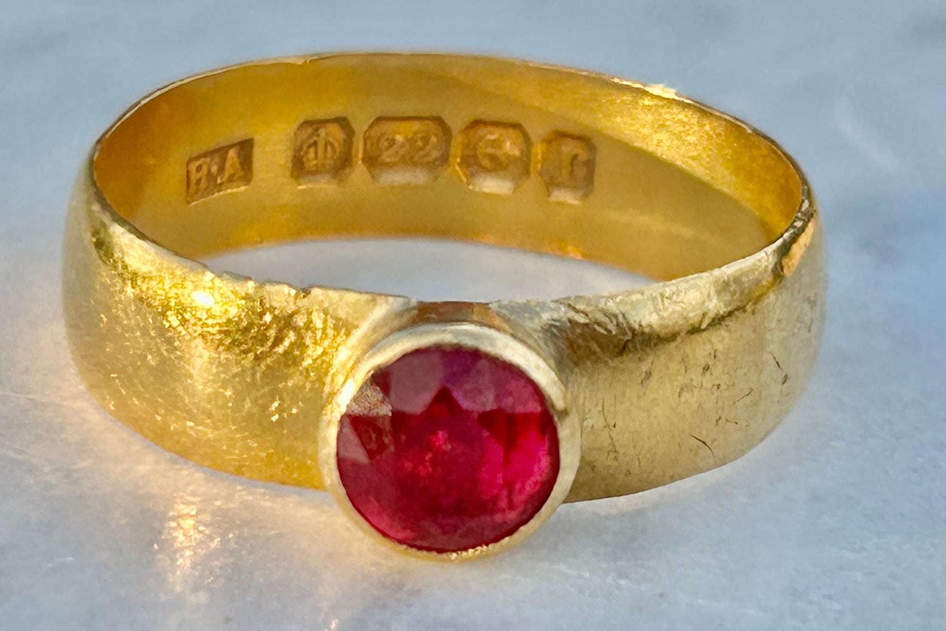 A Buttery 22k bezel set and beautifully round translucent antique Ruby wedding band. By:Atkins Bros.Harry Atkins at Birmingham in 1916. Fully Hallmarked. Purplish Red in color. This is a Substantial and weighty ring at 4.6 grams
