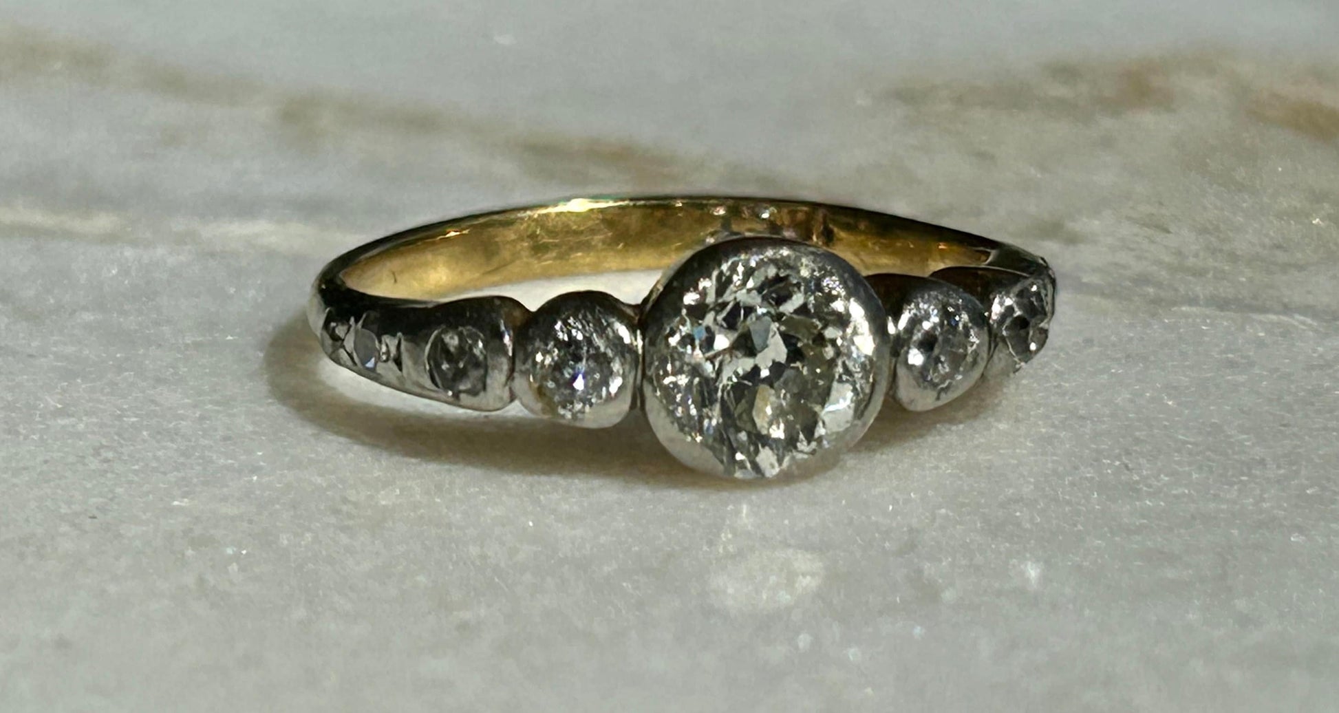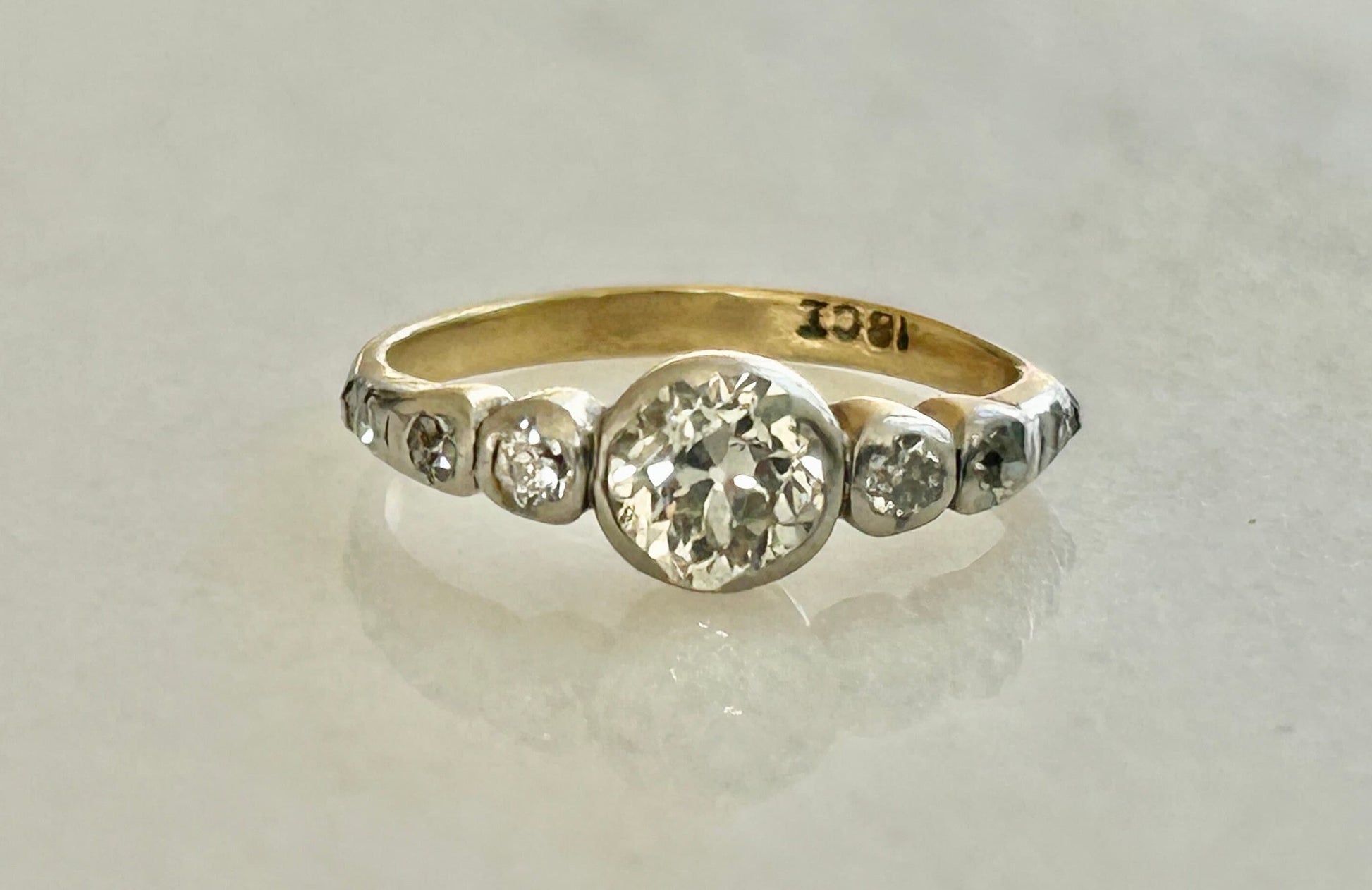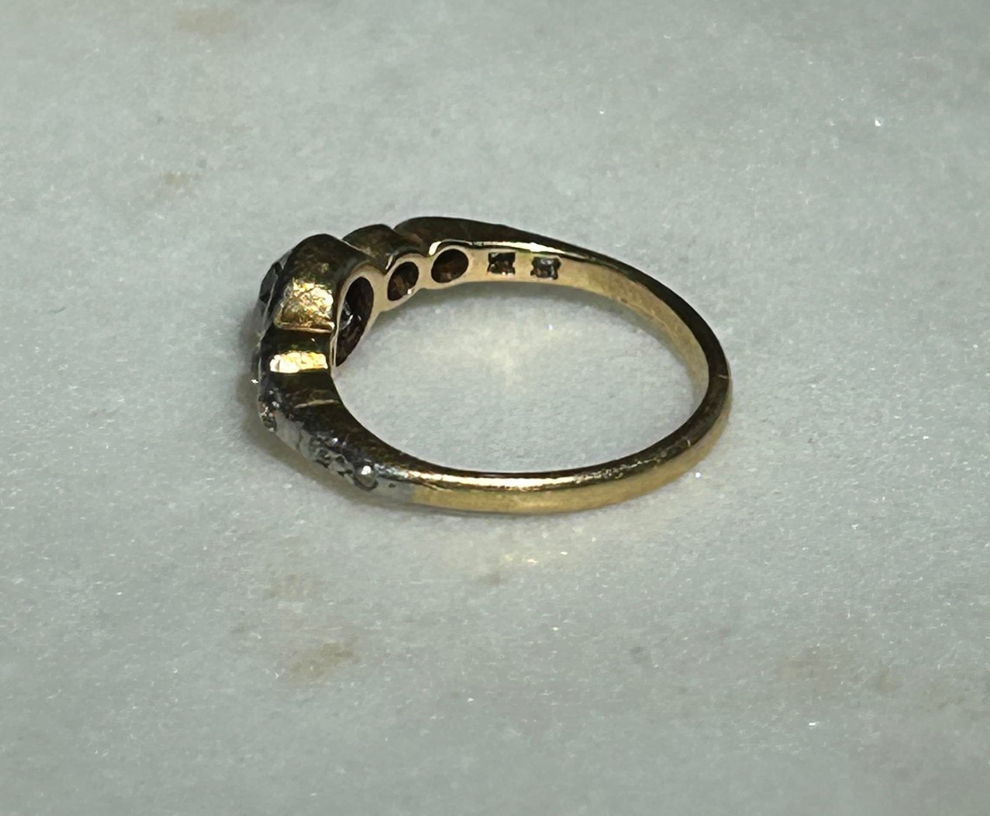 The principal stone is a lively bright old cut diamond of reasonably good colour and clarity. The edge of the rub-over setting is worn but seems secure. The ring has been re-sized and made smaller and the profile is distorted (see extra image). Not hallmarked but stamped 18ct. The rings weighs approximately 2.16 grams.