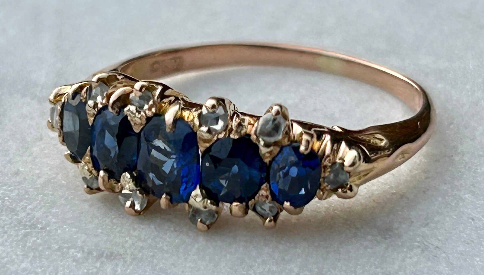 Five Sapphire No Heat Hand Cut stones and Eight Rose Cut bright White Diamonds in 18ct Rose Gold Ring