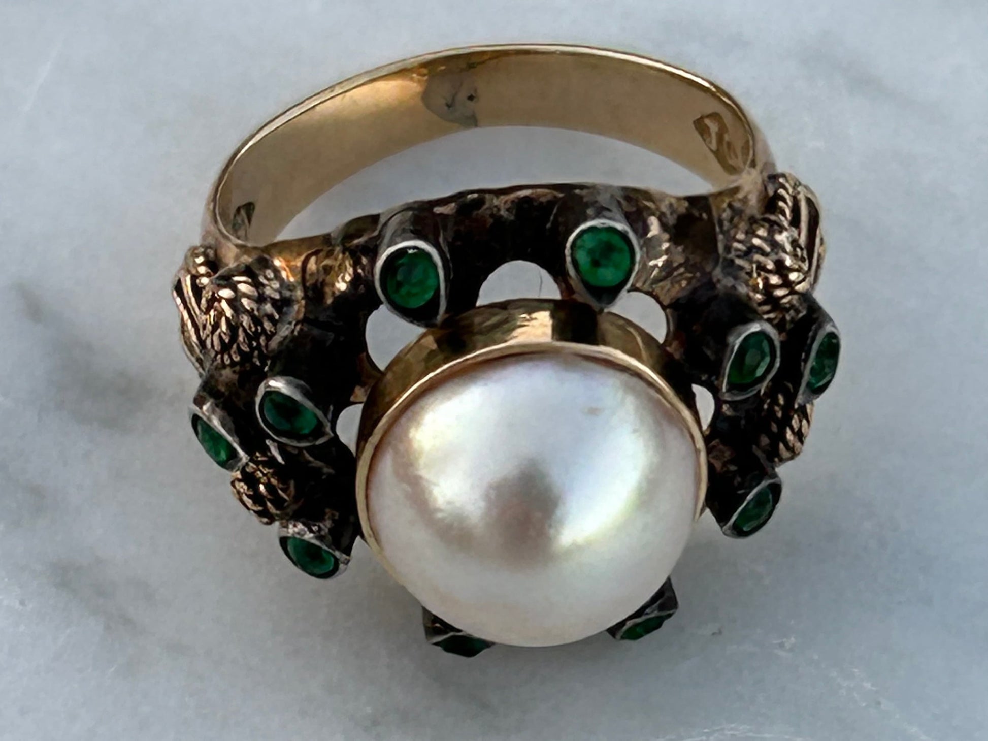 Very unique 18k Gold Mabe Pearl and Emerald Ring. Weight: 5.2 Grams