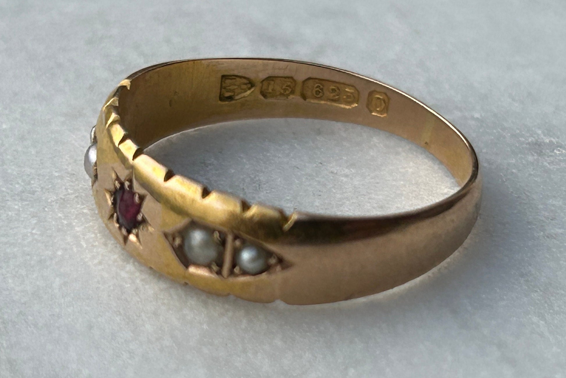 Victorian 15k Gold Ruby and Pearl Gypsy Ring with scalloped band. Natural Ruby in splendid condition for its age.