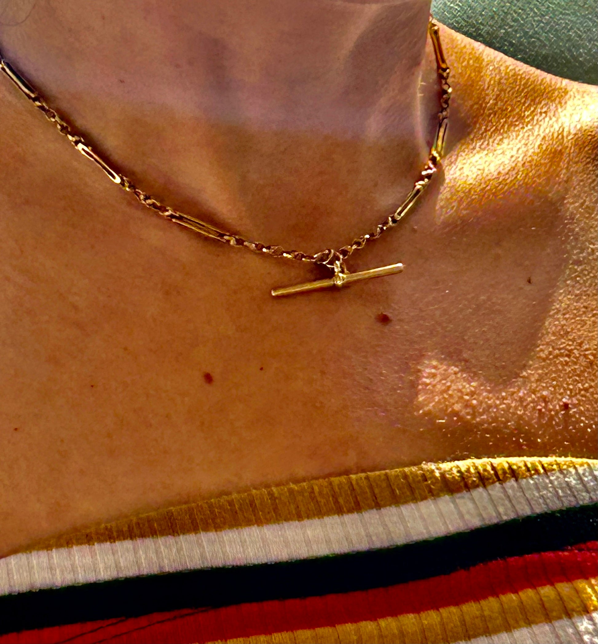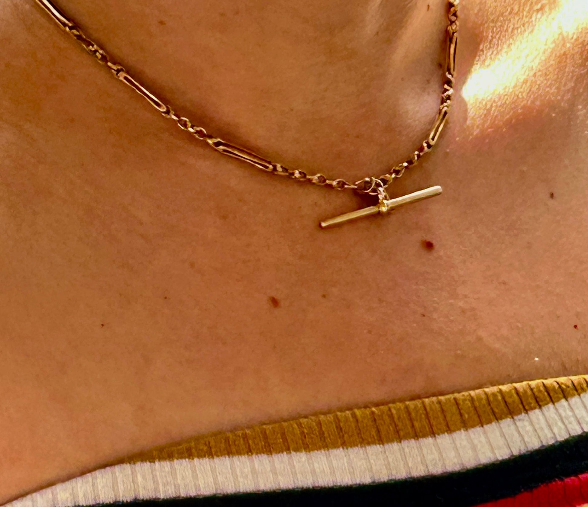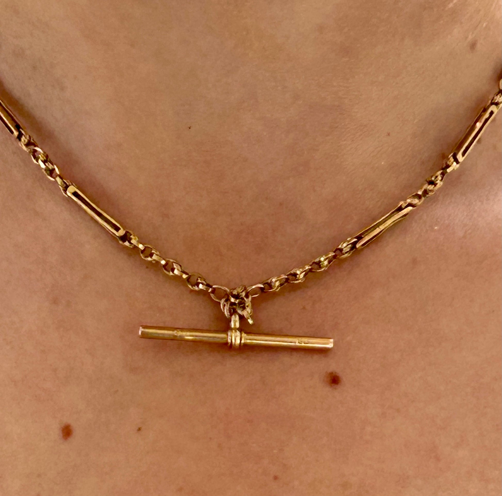 Victorian 9 carat gold Tbar Albert chain Fetter and three with Dog Clip. 8.9 grams