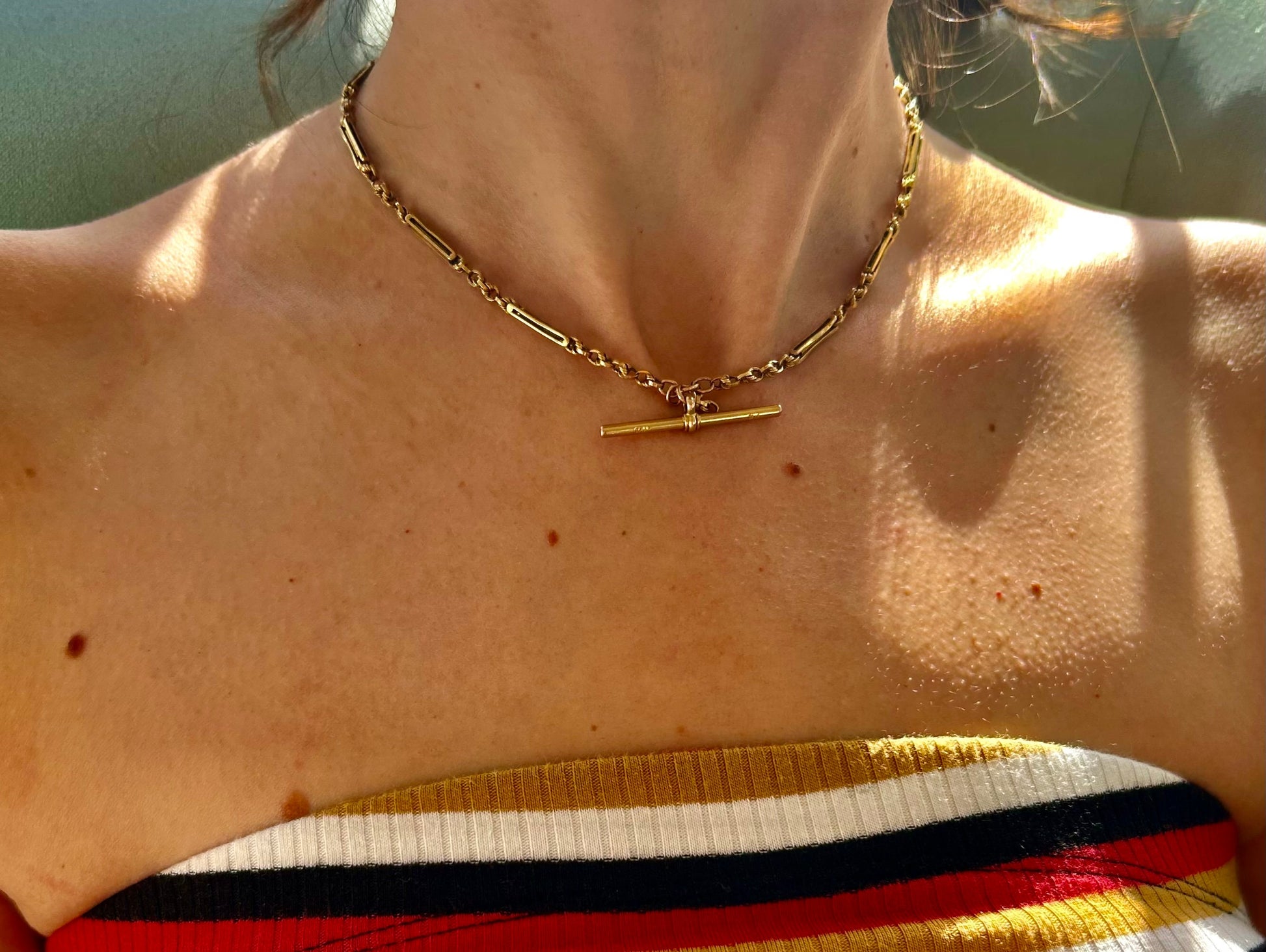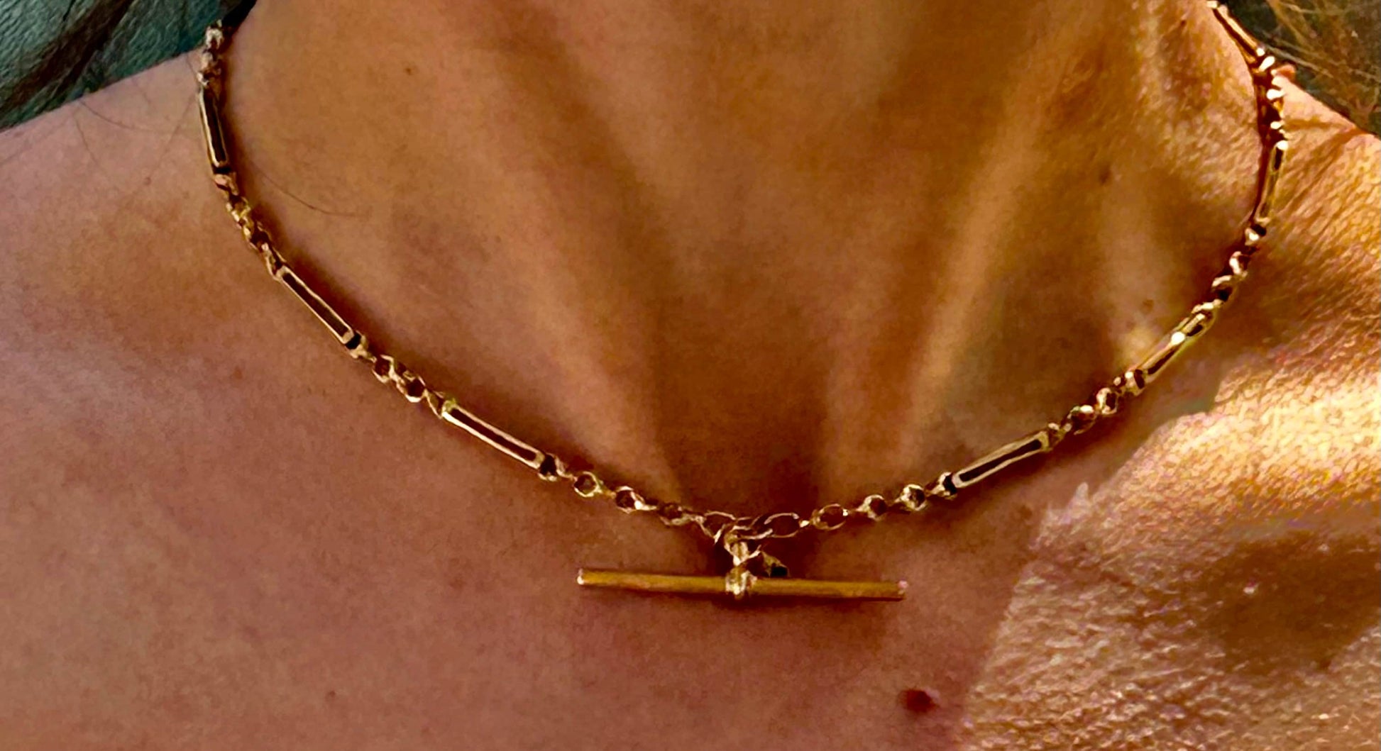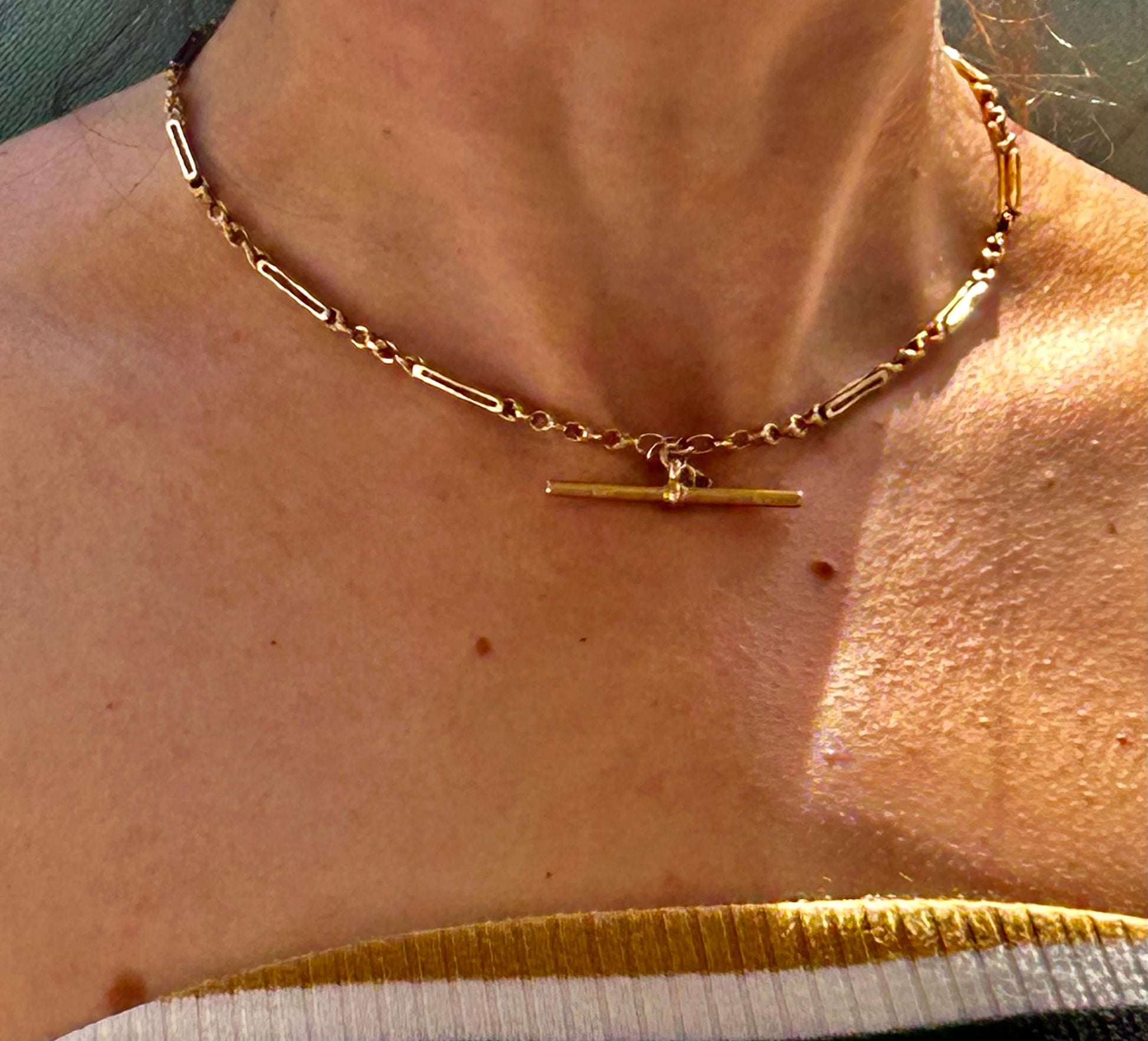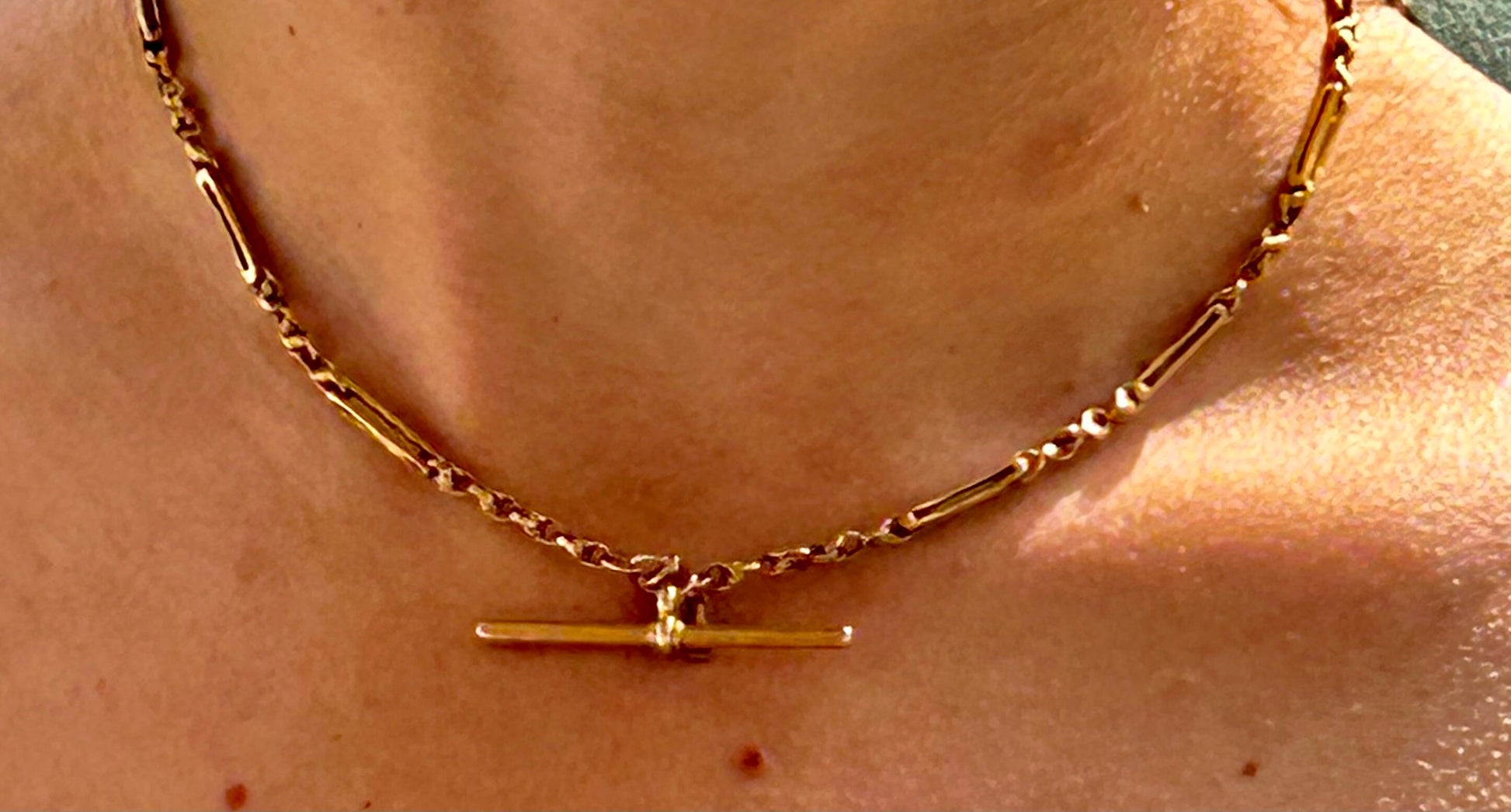 Victorian 9 carat gold Tbar Albert chain Fetter and three with Dog Clip. 8.9 grams
