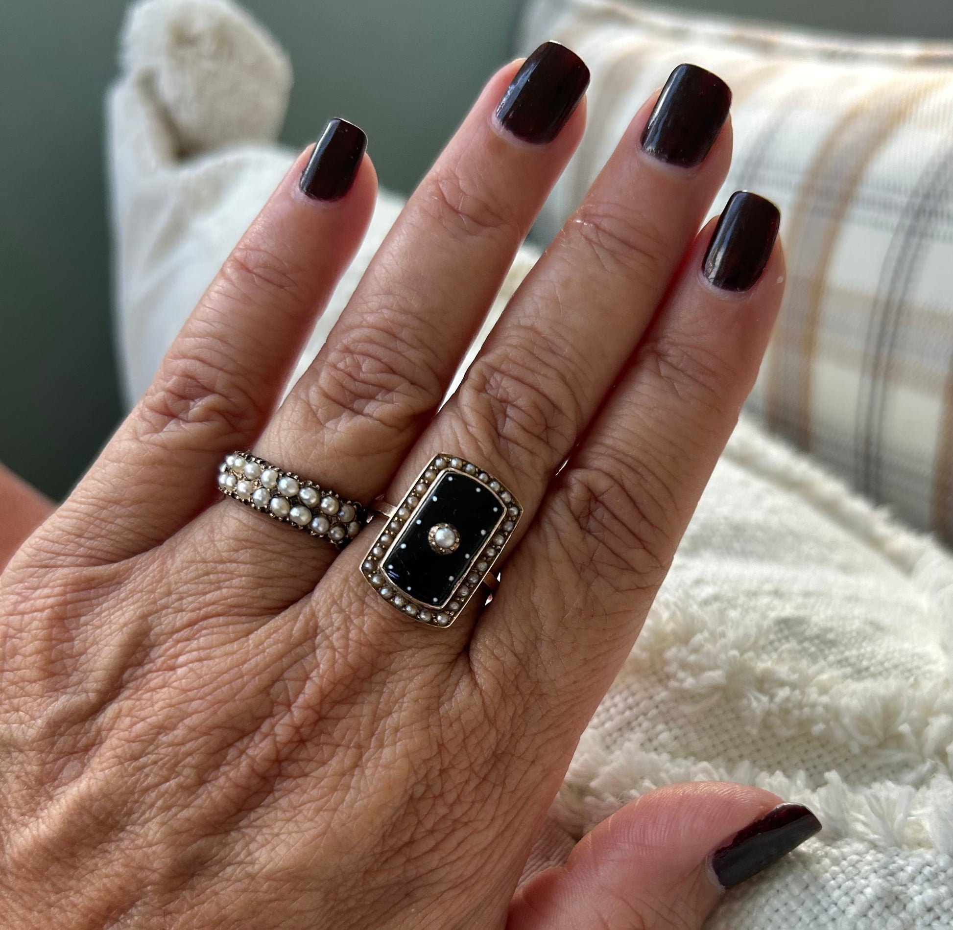 Victorian Mourning Ring Enamel and Split Pearl 9k Gold