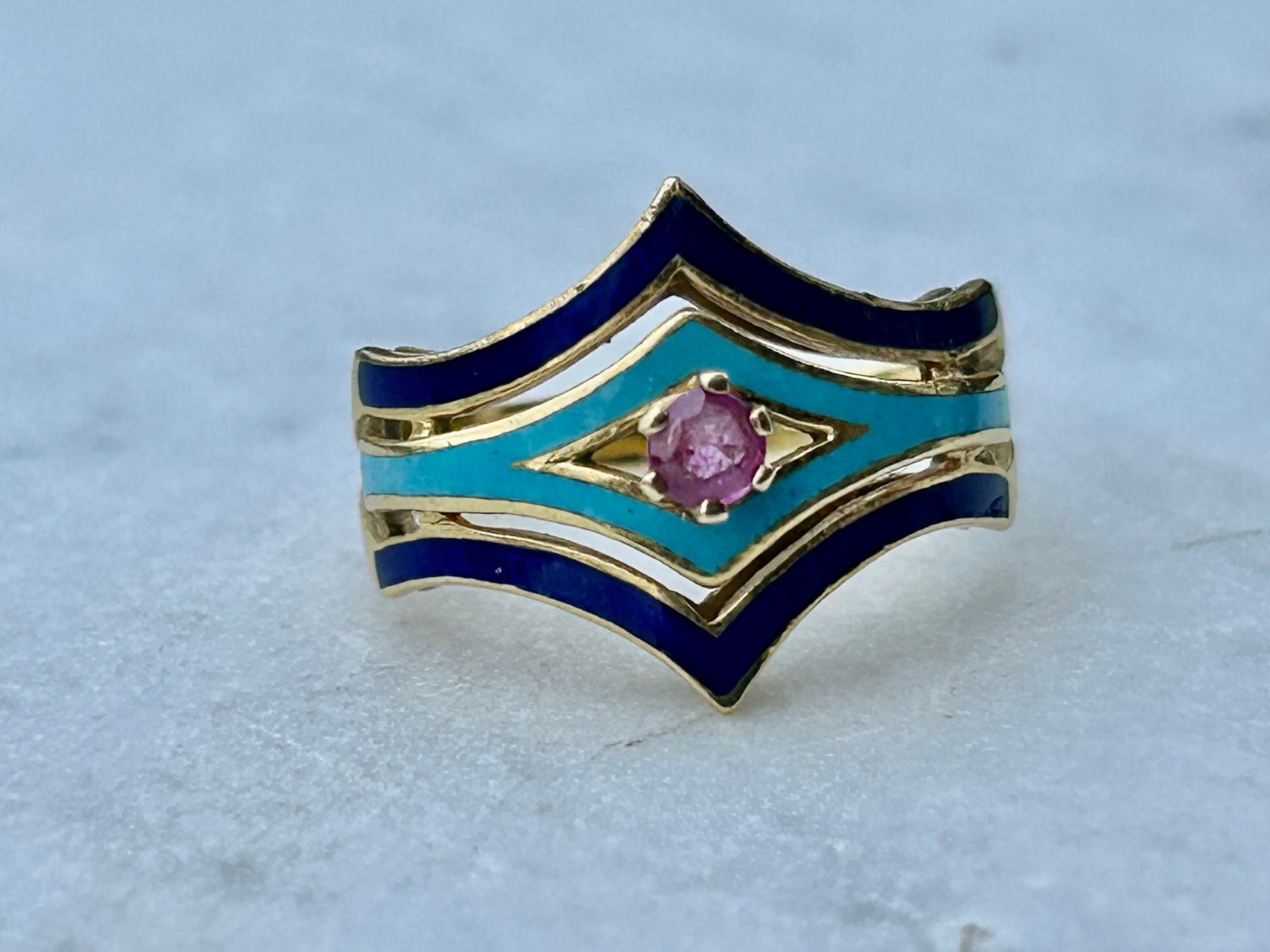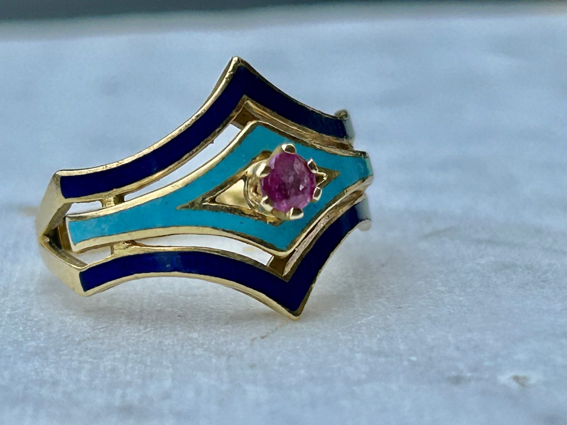 Vintage Brightly colored Midnight Blue,Turquoise Enamel and Ruby. Stamped Italy. 18k Yellow Gold